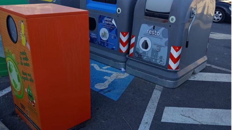 Ahora, contenedores colocados ocupando plazas reservadas en la zona del Praico. Primero se bloquea un acceso sanitario. Ahora se invaden plazas adaptadas.