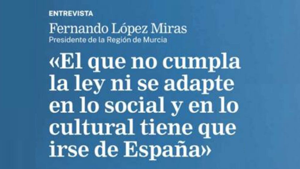 Resultan extremadamente preocupantes declaraciones públicas como las del presidente de la Región de Murcia, que sostiene que quien “no cumpla la ley ni se adapte en lo social y cultural tiene que irse de España”