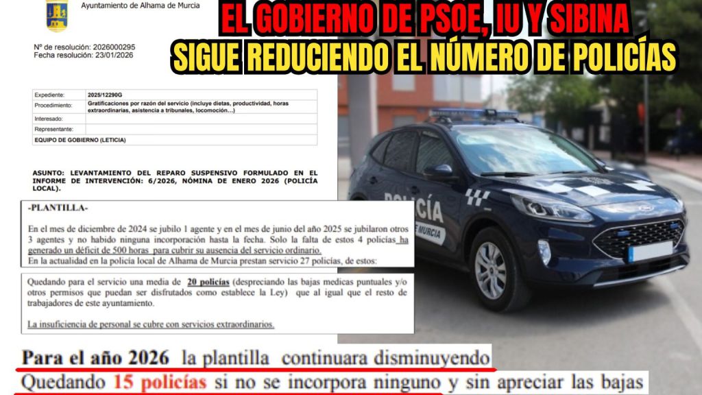 Los datos oficiales del Ayuntamiento confirman lo que todos los vecinos ya sienten en la calle: Alhama está menos protegida que nunca. Mientras la delincuencia sube, los recursos humanos de nuestra Policía Local caen en picado bajo la gestión de Rosa Sánchez.